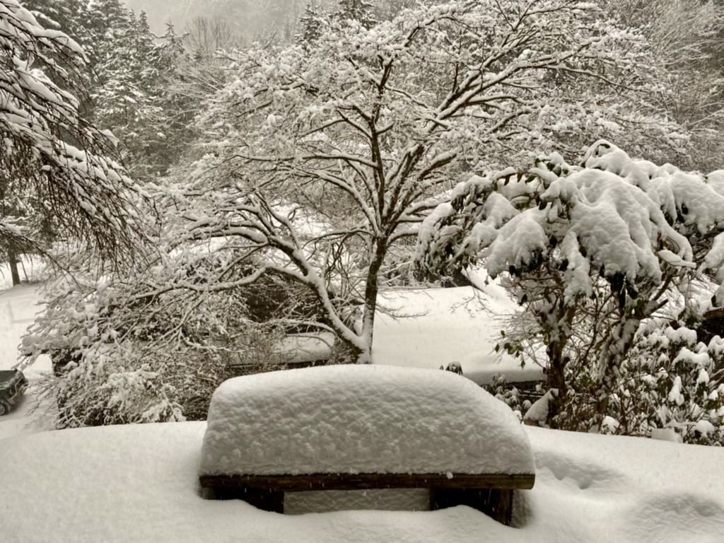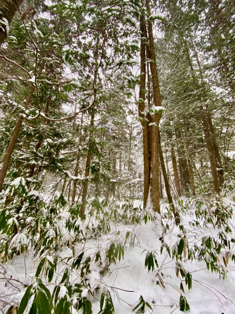 冬季は林道のゲートが封鎖されるため、ランプの宿の方以外は歩いてしか山に入ることができない特別なエリア。われわれ以外は誰もいない、家もない、人工物もなにもない。ただただ純白の世界の中にある、5キロほどの道のりを、宿に向けて歩きました。