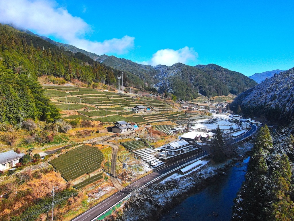 車を降りた井上康生さんが思わず声を上げた場所は、岐阜県東白川村の五加地区。川沿いの段々畑に、見渡す限り一面の茶畑が広がっています。