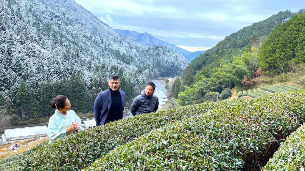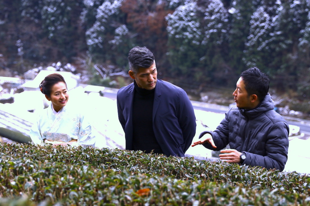 東白川村の茶農家であり、茶師でもある森本健二さんが、井上さん・小堀さんに美濃白川茶の魅力を教えてくれました。茶道家の小堀宗翔さんも、美濃白川茶の産地にやってくるのは初めてです。