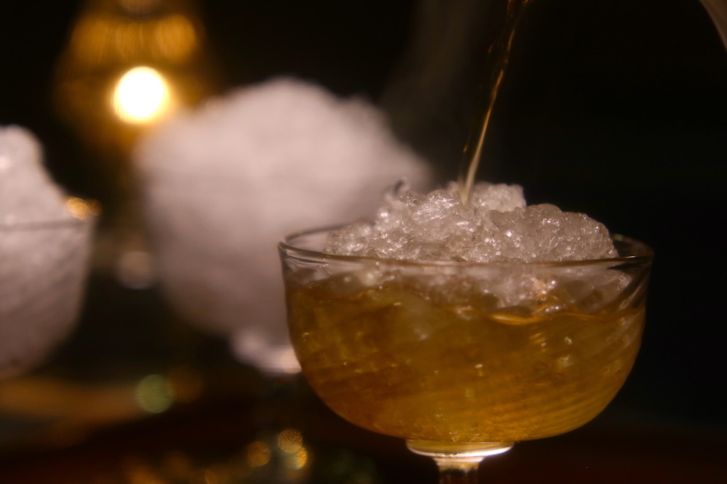市川:今回使わせてもらった茶葉は「中津川ほうじ茶」です。お風呂場でお茶を淹れるということを鑑みて、今回はティーバッグタイプを使用させていただきました。 雪とグラスの容量から400mlのよく沸かした源泉を使用しています。雪が一気に溶けきらないように、 細い注ぎ口のティーポットで少しずつ調整しながら、少しだけ雪を残すところがポイントです。出来上がりの濃度を予測して、ティーバッグは5gのものを2つ使いました